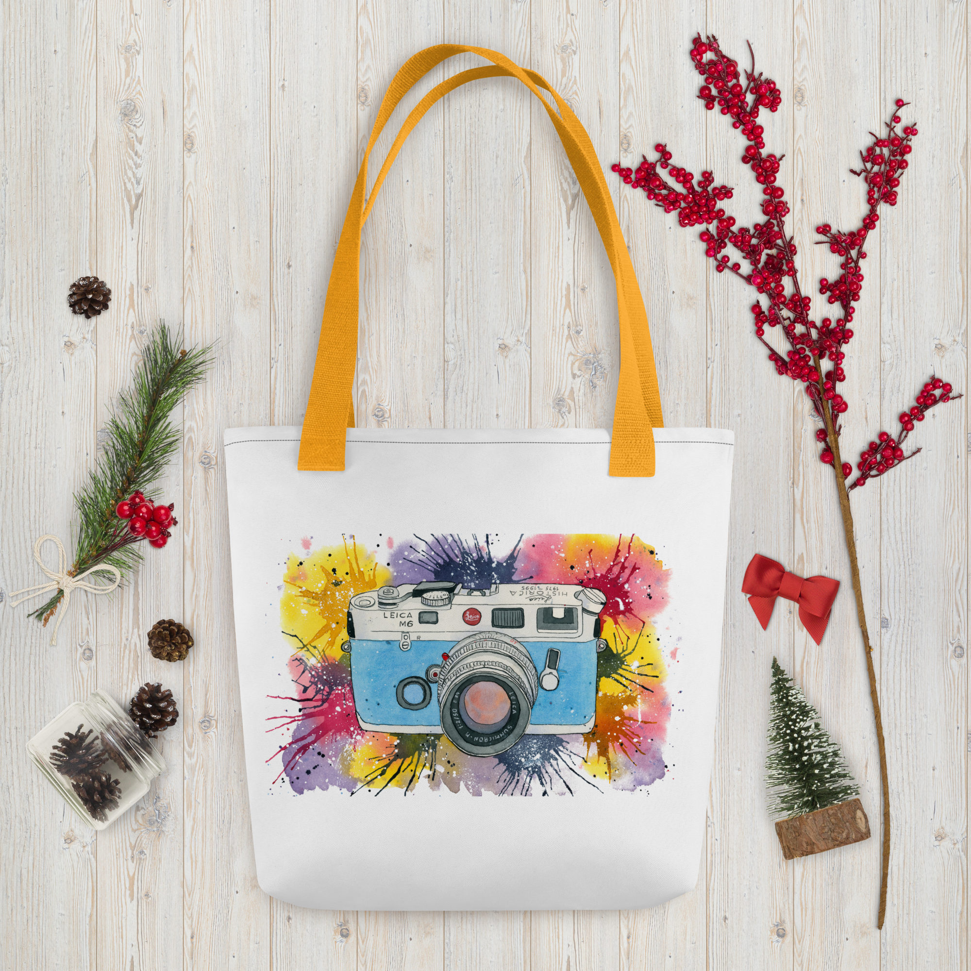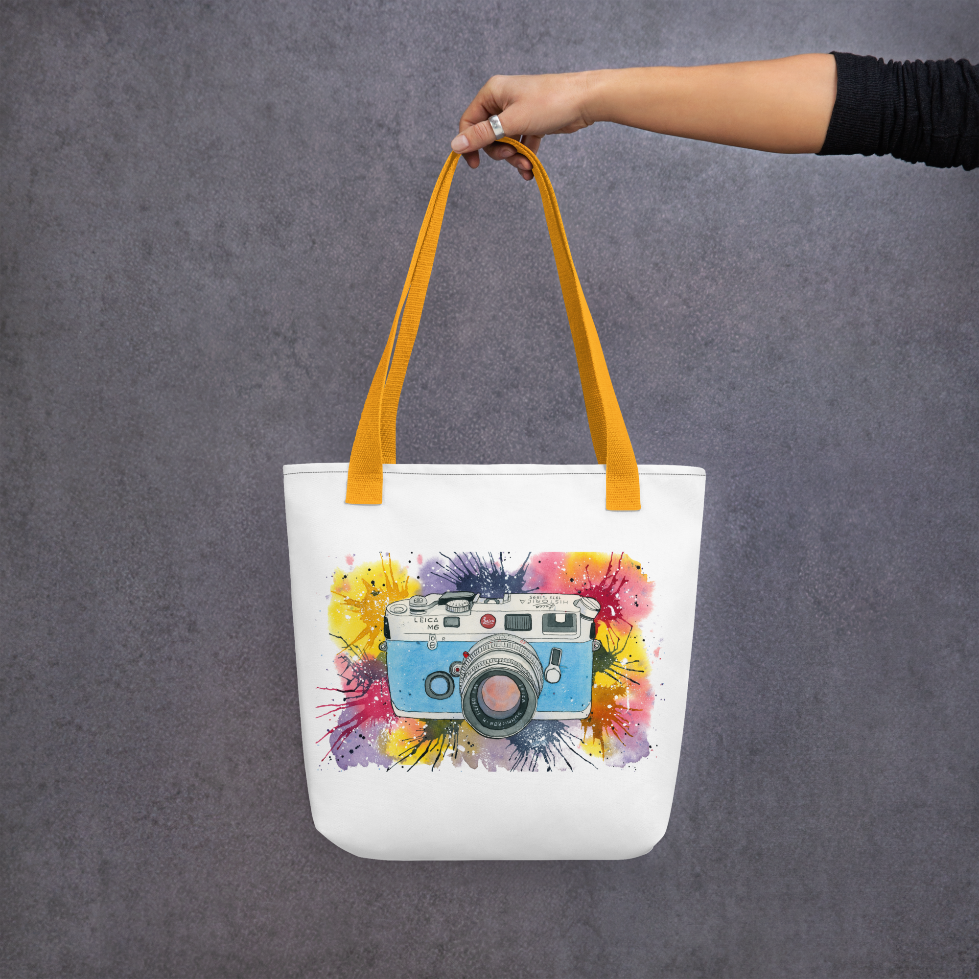 Ilustración original inspirada en la mítica cámara Leica M6 Historica, edición para coleccionistas. Un icono de la fotografía analógica. He querido llevar esa estética a esta bolsa de tela, combinando mi pasión por esta técnica y colorido.